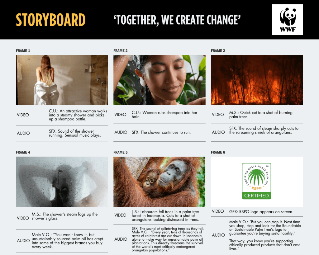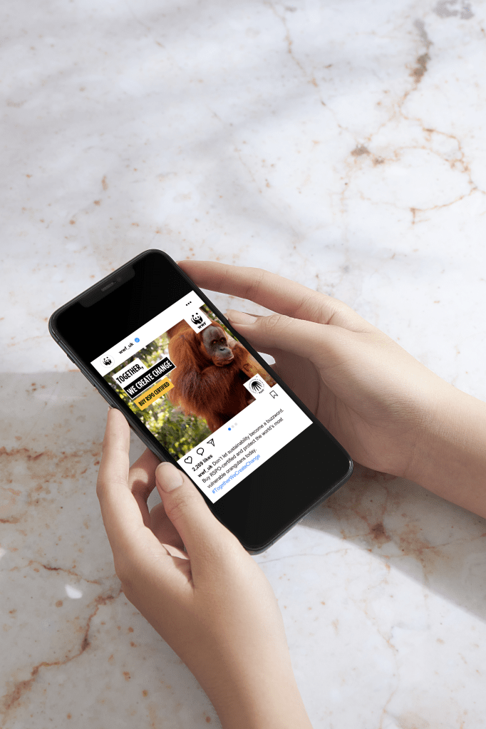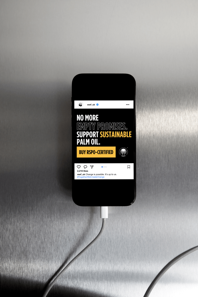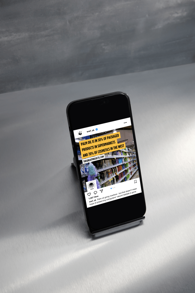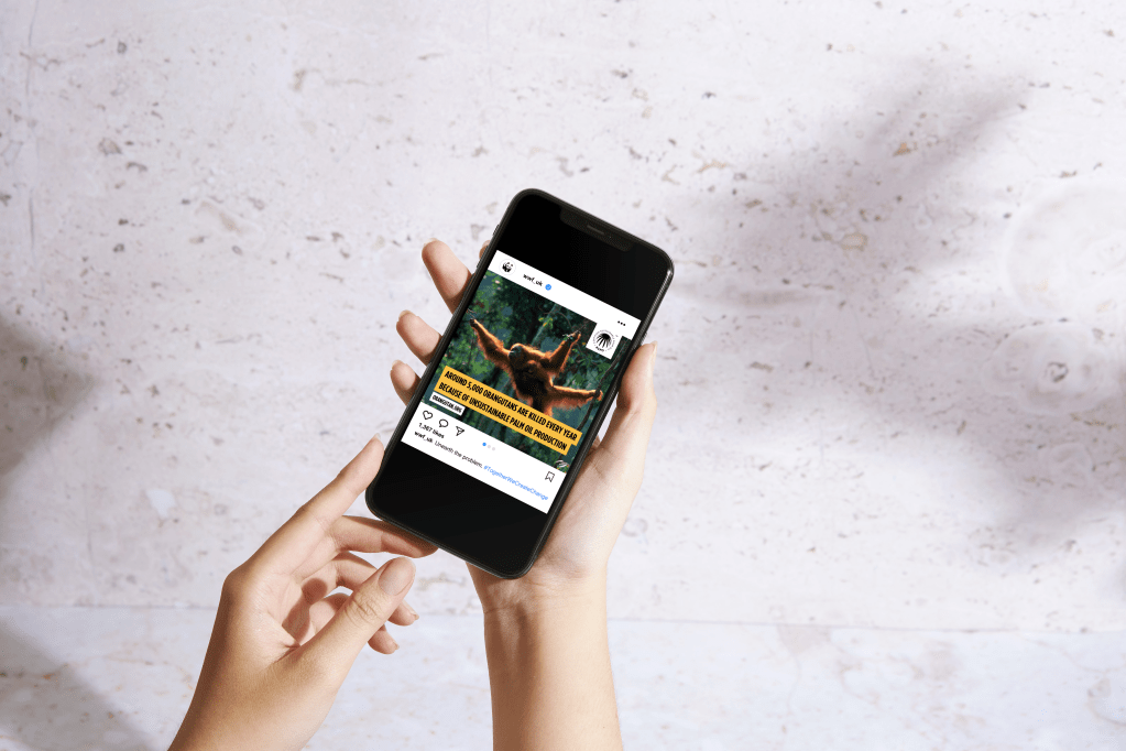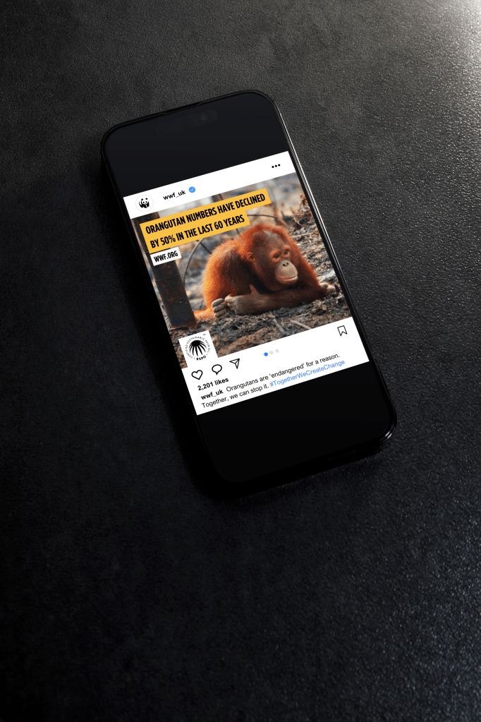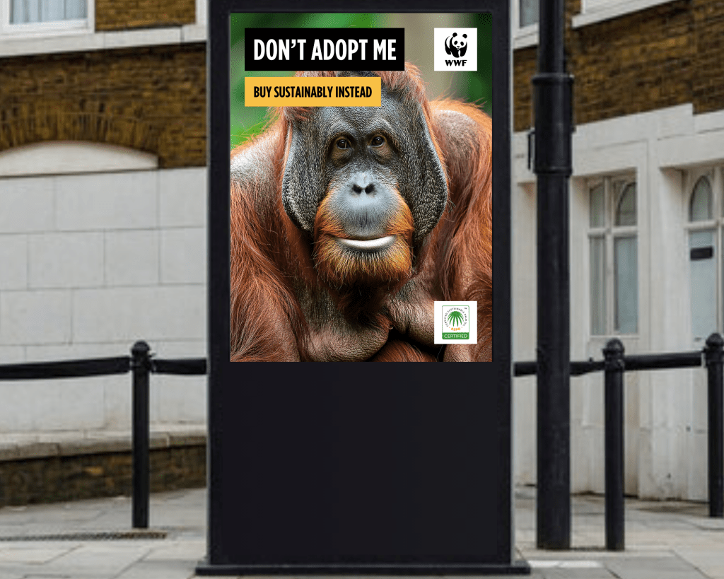 Create a promotional campaign for WWF to raise awareness of the link between unsustainable palm oil production and declining orangutan numbers.