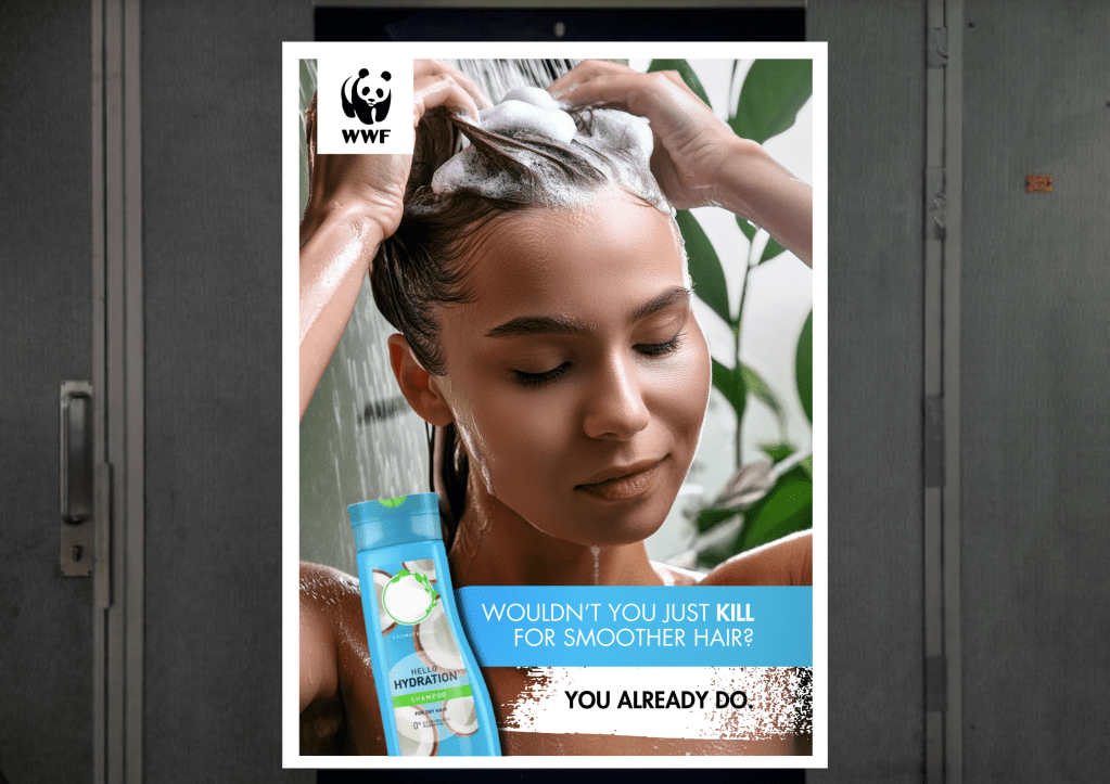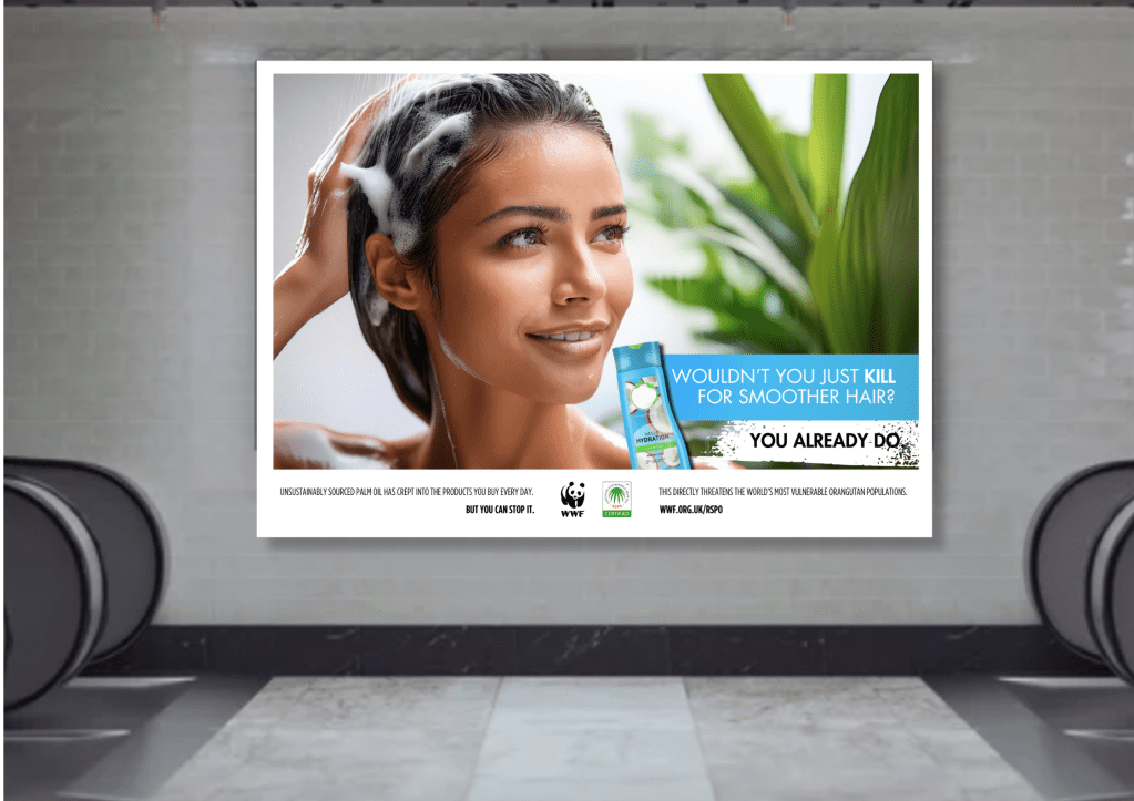 Subvert charity tropes and highlight the presence of unsustainable palm oil in everyday products. This led me to create the taglines ‘Don’t Adopt Me’, ‘‘Wouldn’t You Just Kill For Smoother Hair?’, and hashtag #TogetherWeCreateChange.